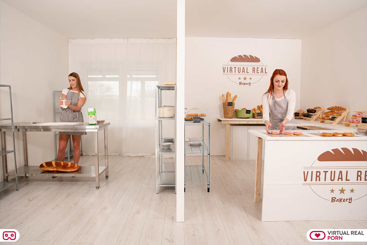 From the point of view of the bakery, Katy Rose is busy sorting through all of the goods. Alexis Crystal is making bread dough in the kitchen at the same time. Alexis is visibly unhappy as she continues to wipe perspiration from her forehead; the heat is intolerable. She finally snaps and removes her top, opting to work in her apron instead. Katy walks into the room just as she begins to caress herself, savouring her alone time. Leaning over the table, she sees Alexis’s bare butt and is startled by her sexual motions. Katy starts to touch herself as she watches Alexis, completely enthralled. After Alexis becomes aware that someone is watching her, they exchange knowing glances and decide to have intercourse while sitting down.