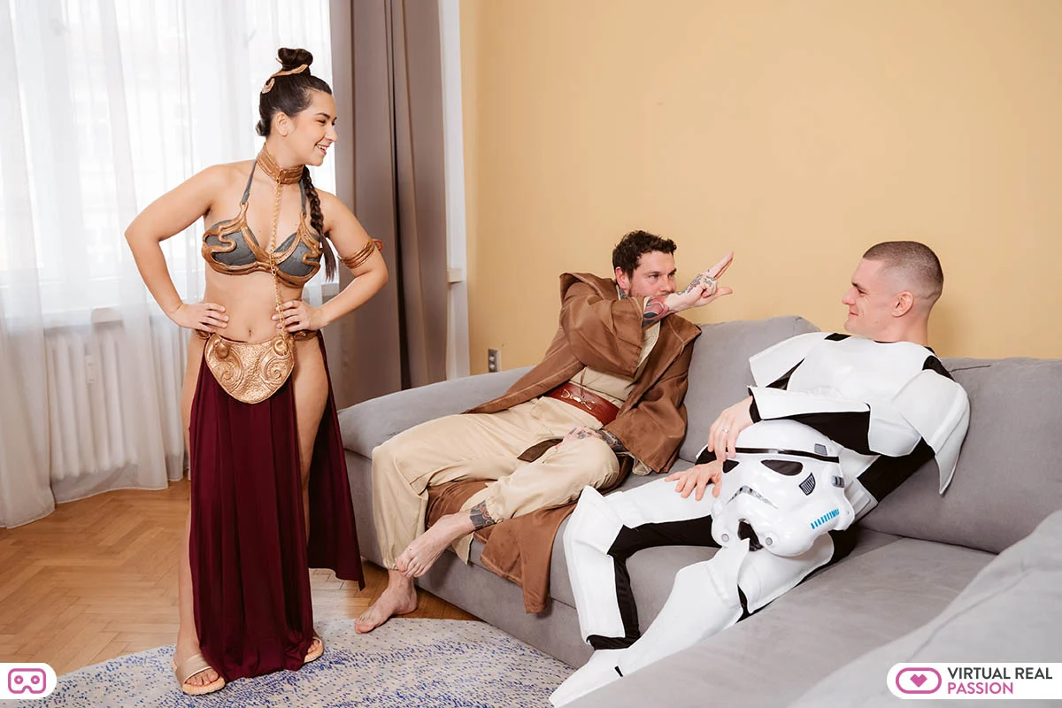 When getting ready to attend comic con dressed up in cosplay as Star Wars characters, you notice that your two geeky male friends are getting turned on by your Princess Leia outfit. You had put both of the nerds in the friendzone a long while back, but maybe it’s because you are in character as Princess Leia, that you are feeling a little horny yourself. You decide that even geeks need to get laid once in a while, and so you let the two geeks have a sympathy fuck. They take turns licking your pussy out, visibly in seventh heaven at achieving their lifelong dream of having sex with Princess Leia. The two take off their outfits to reveal their bulging erections, and you notice that they both have better bodies than you ever imagined. Now your pussy is getting very wet, and this ‘symapthy fuck’ is going to turn out to be one of the best threesomes you’ve ever enjoyed!